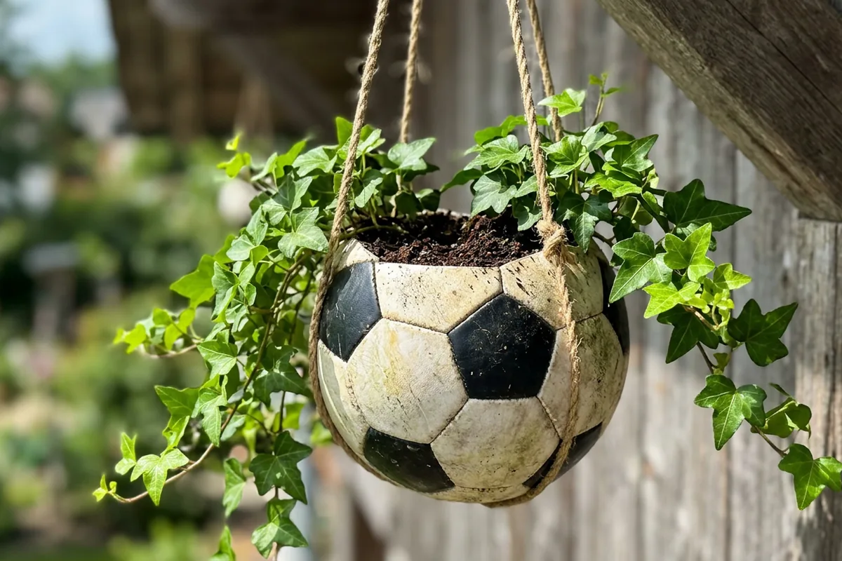 Jednym z najpopularniejszych sposobów na recykling jest przekształcenie piłki w wiszącą doniczkę. Wystarczy, że wykonasz precyzyjne nacięcie z jednej strony, tworząc otwór na ziemię i roślinę.